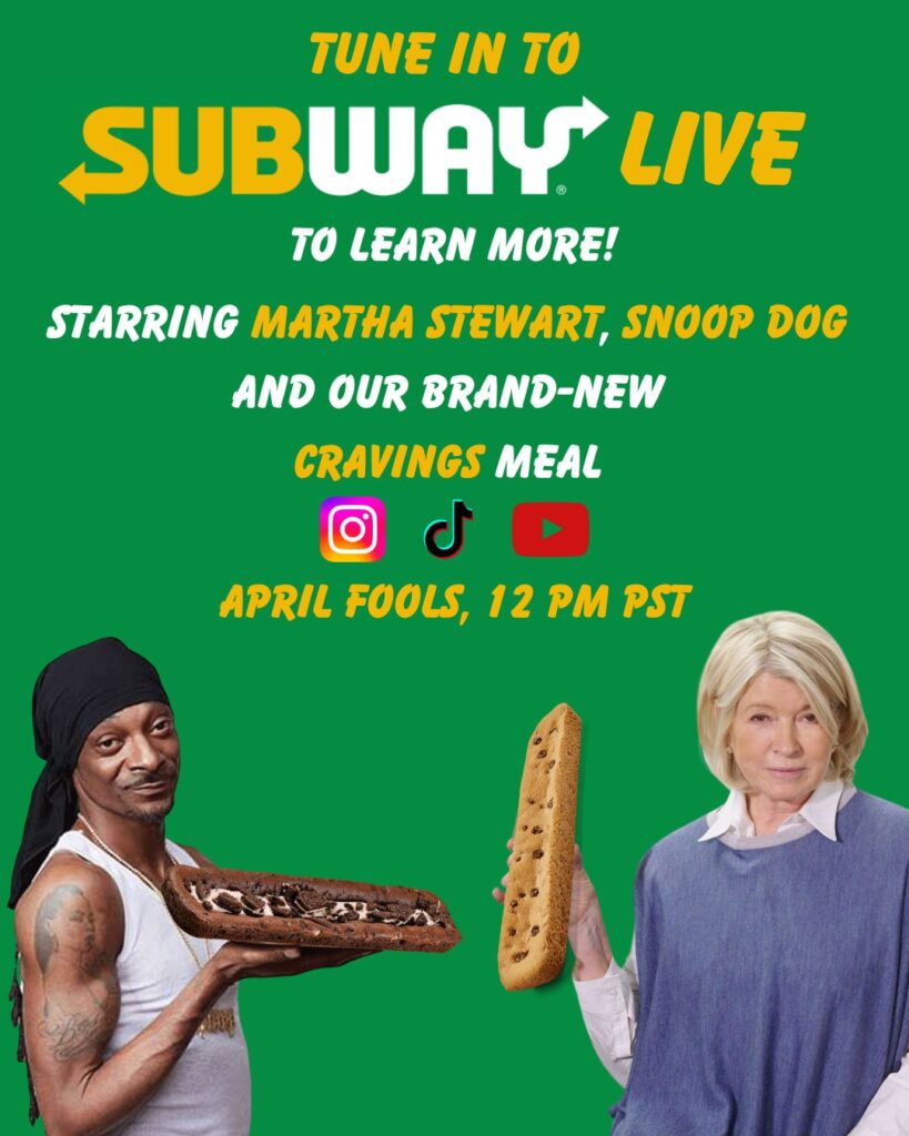 To commemorate the launch of the Cravings Meal, we’re also hosting the first-ever Subway Live, a live broadcast with exclusive coverage on new Subway products and fan experiences. Special guests Snoop Dogg and Martha Stewart will guide fans through the innovative new products in the world of Subway and will be among the first to taste-test the new Cravings Meal, perfect for the munchies!